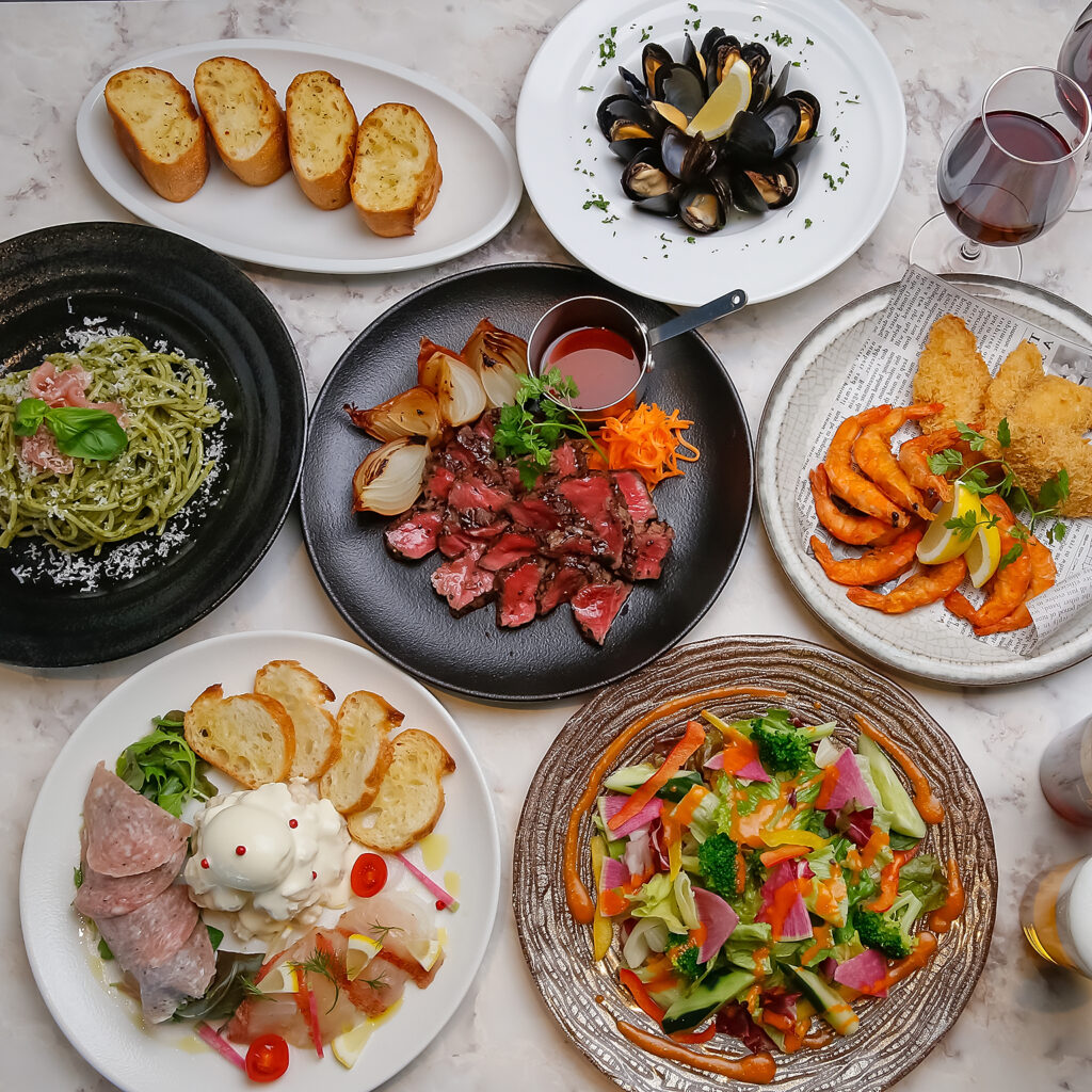 ダンケ◆ 「淡路産牛 赤身肉のグリル」がメインのコース。「ムール貝のワイン蒸し」「淡路麺業の生パスタを使用したジェノベーゼ」など豪華逸品が勢揃い!