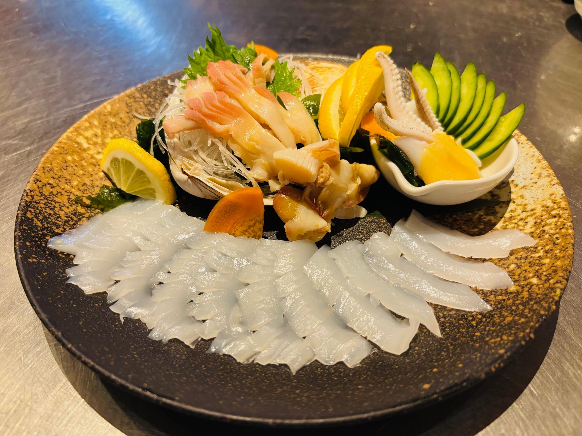 【百干の刺身】 こちらは、お客様のお好みでご注文された一皿。 ・北海道 北寄貝 ・能生 あおりいか (ぜひ写真を拡大して、あおりいかの飾り包丁を見てください👏) 当店では、その時々でお皿や盛り付けが違うのも魅力です! お客様に、食器の写真を撮らせて欲しいと言われることも😊 もちろん、新潟糸魚川直送の刺身も鮮度抜群です! ぜひ、ご来店の際は当店自慢の刺身をご賞味ください😊