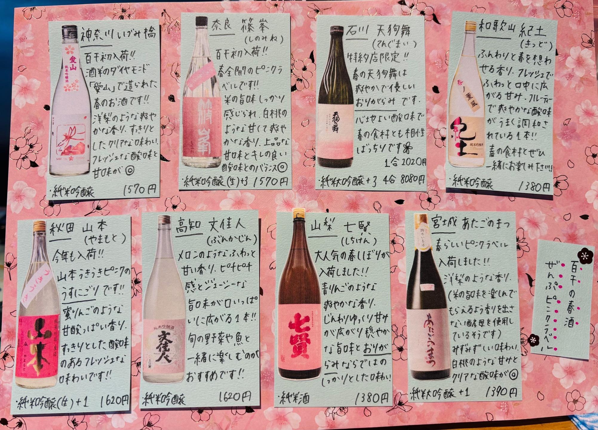 百干の春酒🌸 百干の日本酒メニューは、ピンク! 全ボトルピンクで揃えました😊