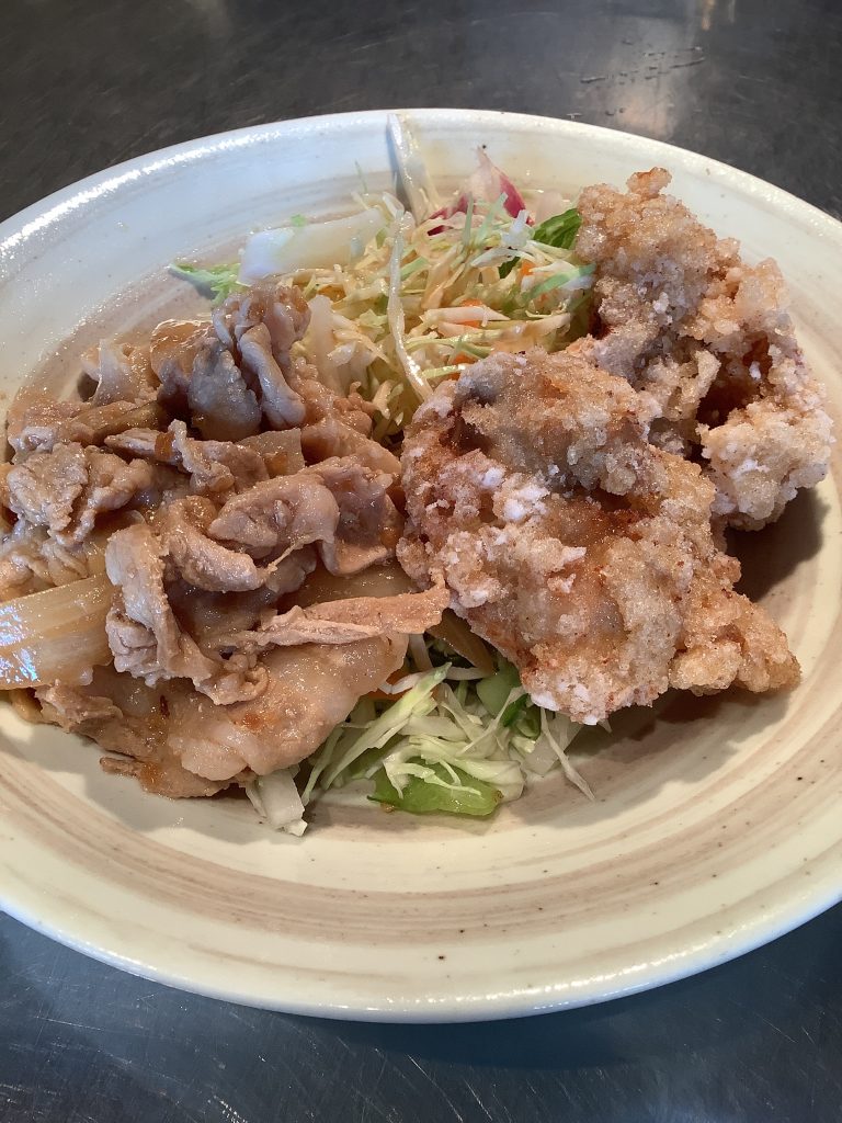 ボリューム満点‼︎豚バラ肉の生姜焼きと鶏唐揚げランチ
