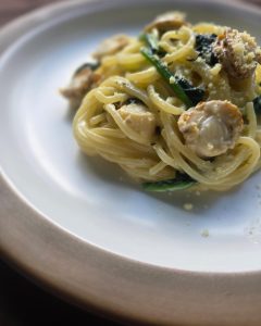 こちらは今月のオススメパスタ ベビーホタテとほうれん草のガーリッククリームです!