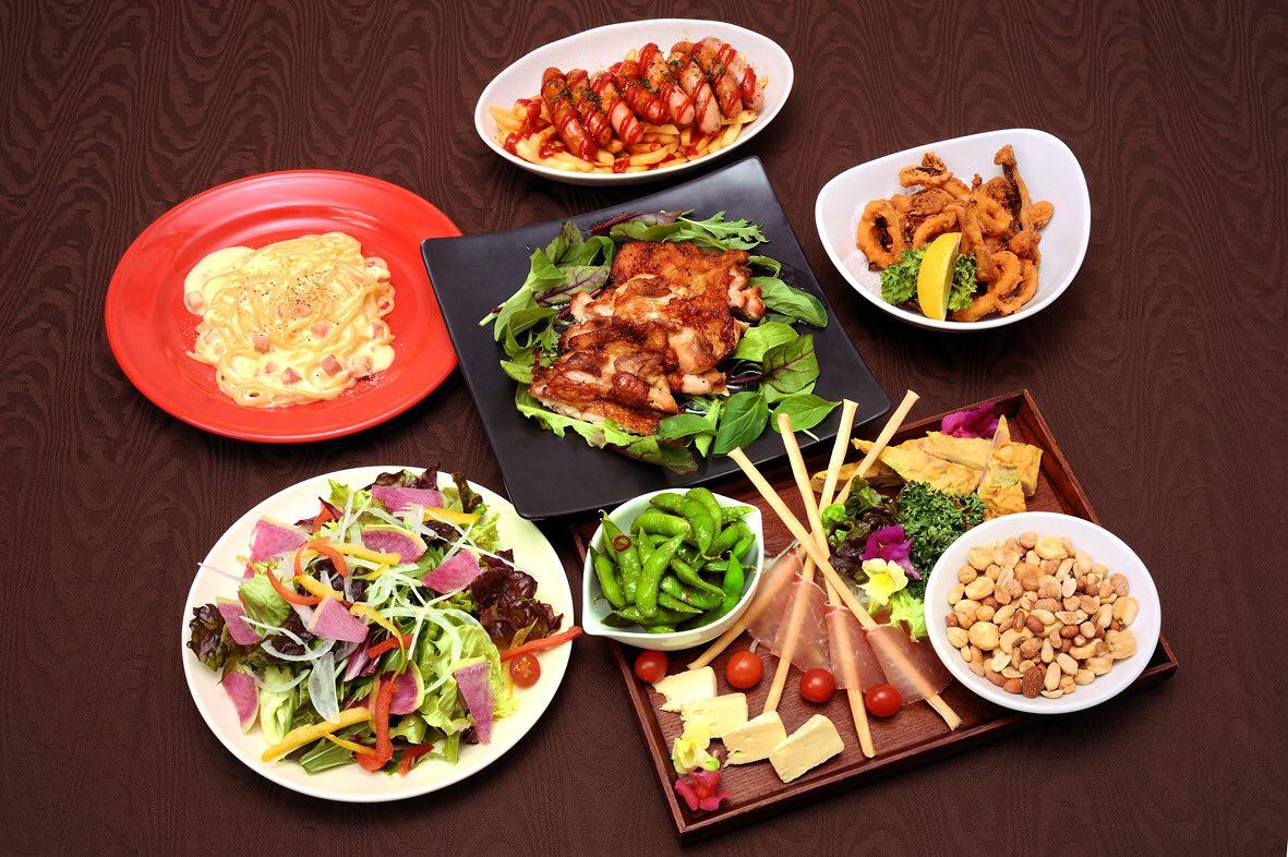 ・オードブル盛り合わせ ・彩りサラダ ・イカの唐揚げ ・カリーブルスト ・チキンのレモンステーキ ・カルボナーラ(淡路麺業の生パスタ使用)