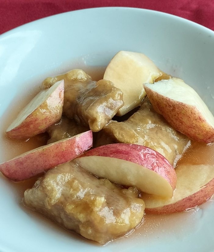 えっ・・・りんご?黒酢や甘酢が定番ですが、りんごの酸でお肉も柔らかく甘酸っぱい一皿です。