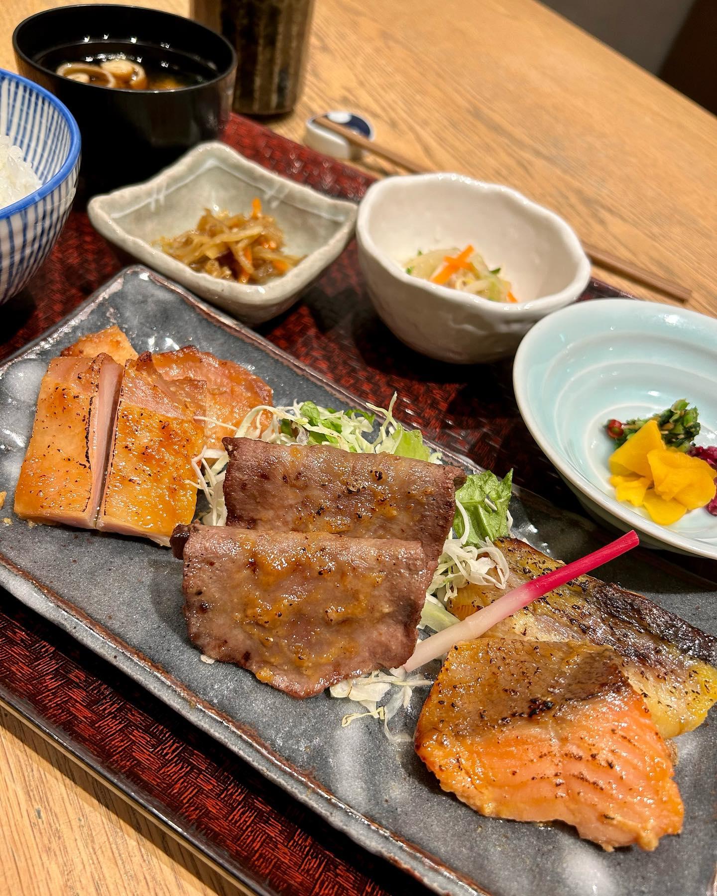 くらまの味噌漬け魚も肉も楽しみたいというお客様 “にぎわい膳”おすすめです 鮭の金山寺味噌漬け焼き 銀鱈の西京味噌漬け焼き 牛タンと鶏の金山寺味噌漬け焼き 日替わり小鉢2品と漬物 ご飯味噌汁はおかわりできます