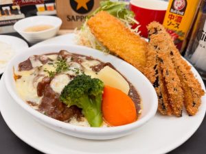 ▶️黒毛和牛スジのデミグラグラタン &茄子とイカのフライ