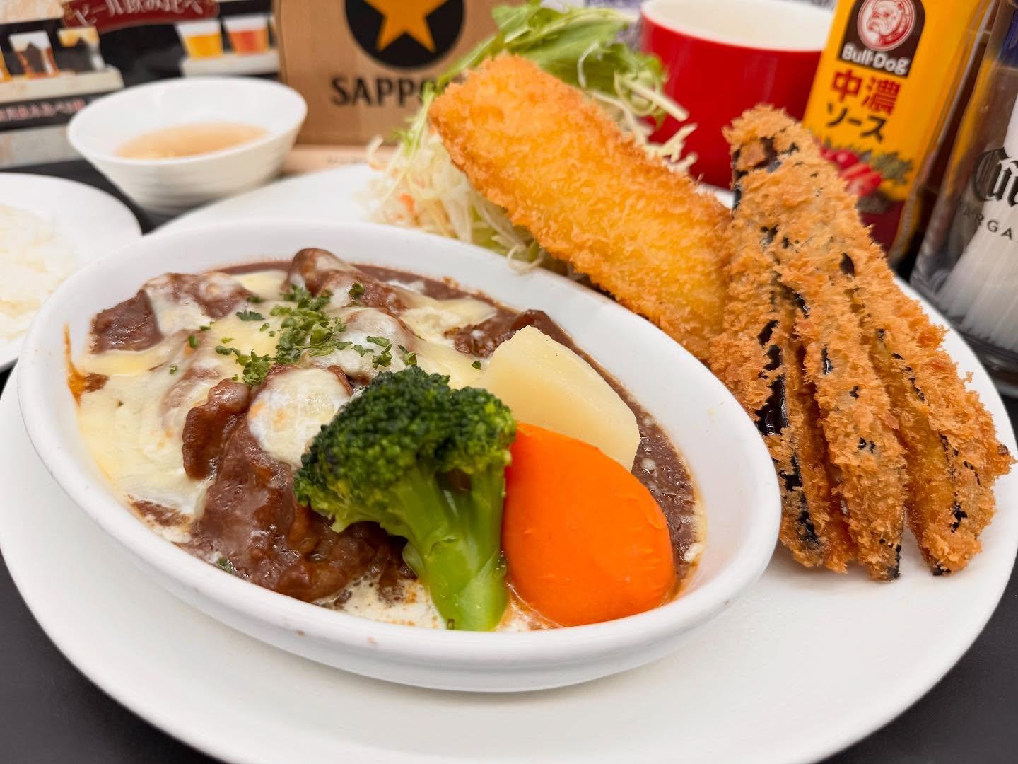 デミグラスソースでじっくり コトコト煮込んだトロトロの 黒毛和牛のスジを野菜とチーズを 乗せてグラタンに!!✨🤍 相方は茄子とイカのフライとなっております。 とってもボリューミーなスペシャルランチを ぜひご賞味ください‼︎ ーーーーーーーーーーーーーーーーーー ビヤハウス森卯