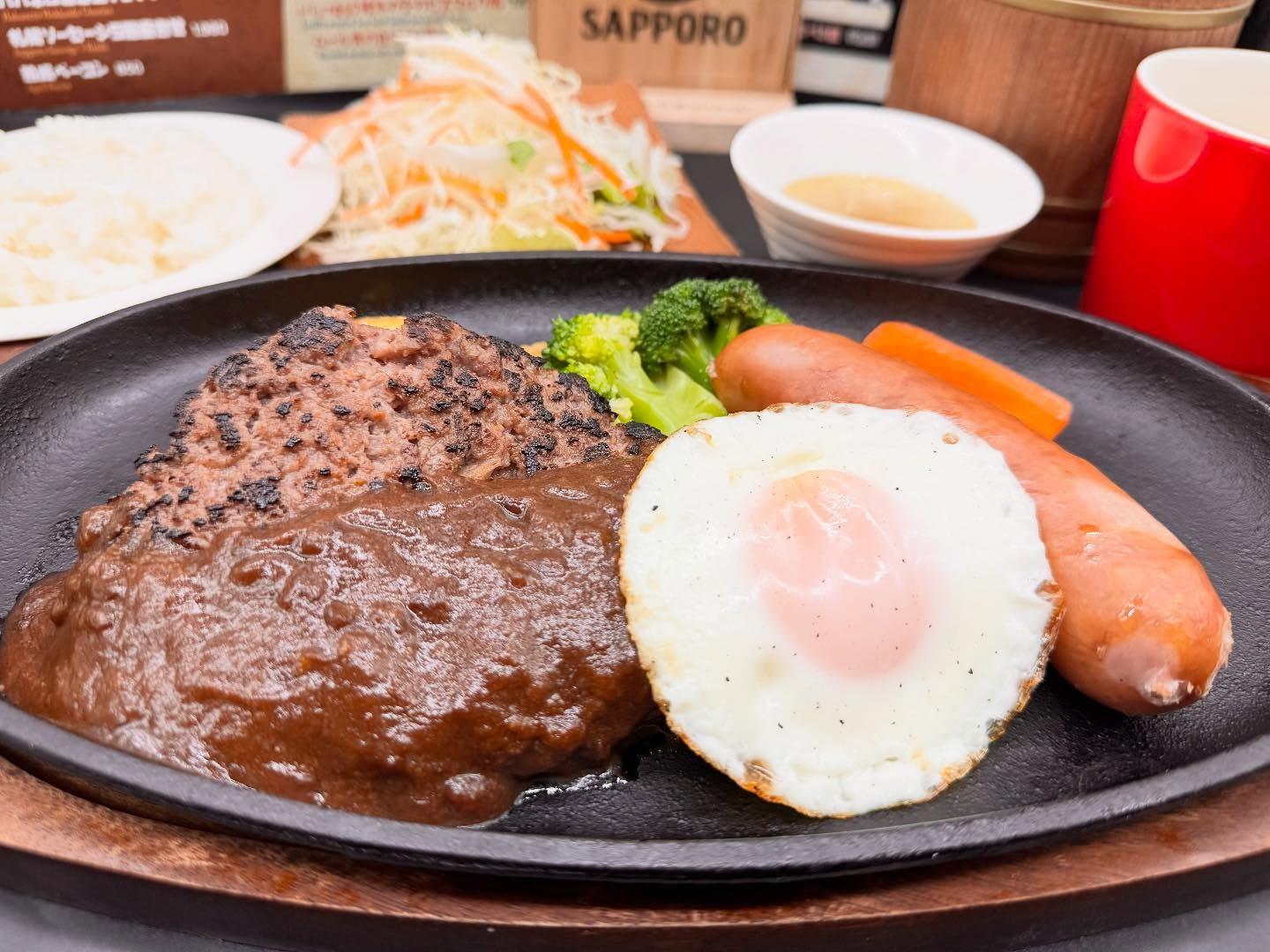 ジューシーな合挽き手ごねハンバーグを あめ色玉葱の甘味とスィートワインの酸味を 感じられるデミグラスソースで お召し上がり下さい✨🤍 目玉焼きと食べ応えのあるフランクソーセージで わんぱくプレートとなっております‼︎ ーーーーーーーーーーーーーーーーーー
