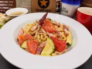 ▶️熟成ベーコンとズッキーニ& フレッシュトマトのペペロンチーノ