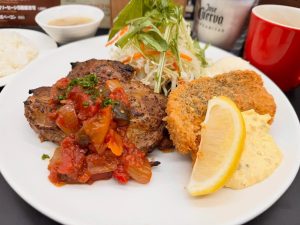 ▶️ケバブ風チキングリル&鱈フライ ~夏野菜のトマト煮込み添え~