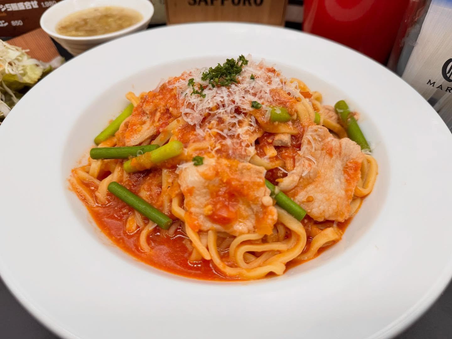 豚バラとシャキシャキ食感のにんにくの芽を 野菜の旨みと甘味たっぷりの 自家製🍅ソースにガーリックを効かせた スタミナ満点🌸のトマトソースで お召し上がり下さい✨🤍 削りたての濃厚な香りの パルメジャーノとともにぜひご賞味下さい🧀 ーーーーーーーーーーーーーーーーーー