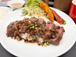 溶岩石で香ばしく焼いた アンガス牛肩ロースのステーキと🥩 季節の野菜をご飯と一緒に 玉葱の甘味にガーリックがほんのりと効いた🧅 和風シャリアピンソースでお召し上がり下さい✨🤍 ーーーーーーーーーーーーーーーーーー