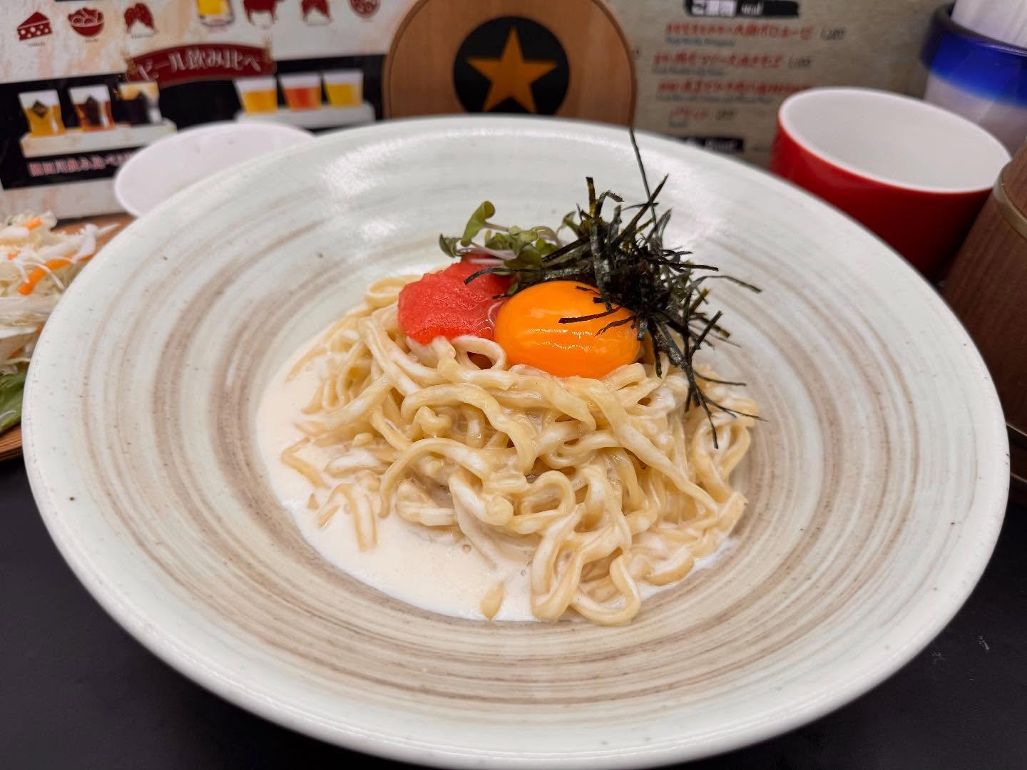 和風出汁の旨味と風味を感じる やさしいカルボナーラに なっております✨🤍 明太子と卵黄を混ぜてご一緒に お召し上がり下さい🥚 ーーーーーーーーーーーーーーーーーー