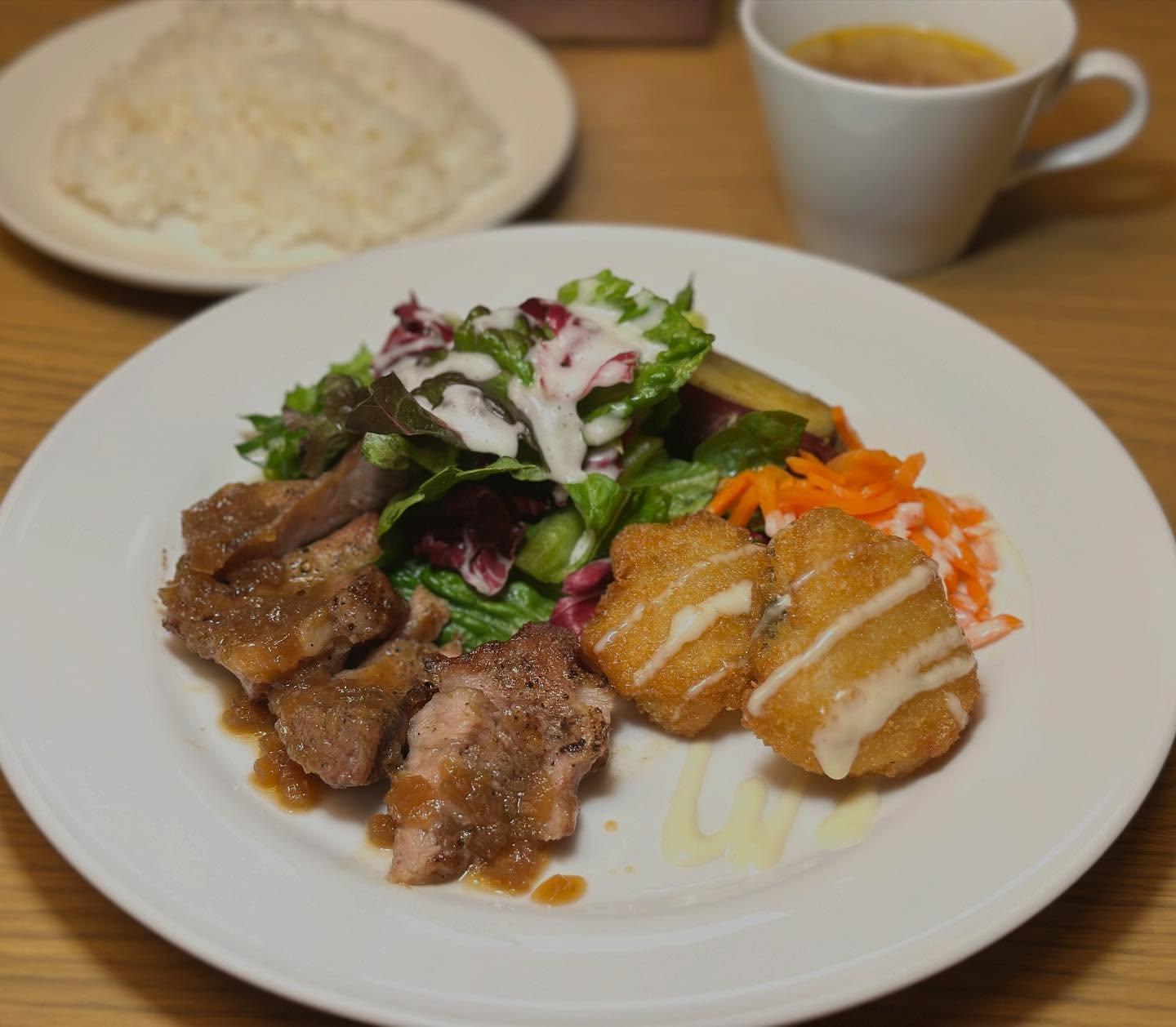 シャキシャキ野菜のサラダ🥗、彩り副菜🥕、スープ🥣、ごはん🍚付きです❗️