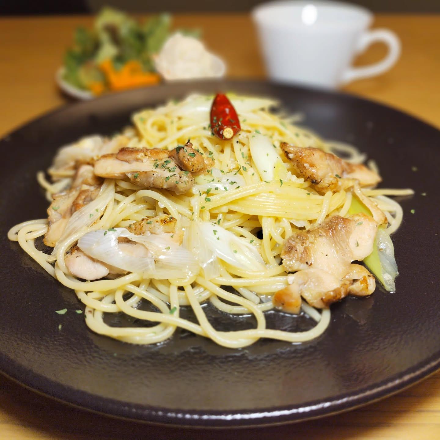 🍗\グリルチキンと長ねぎの和風ペペロンチーノ/🌶️🧄