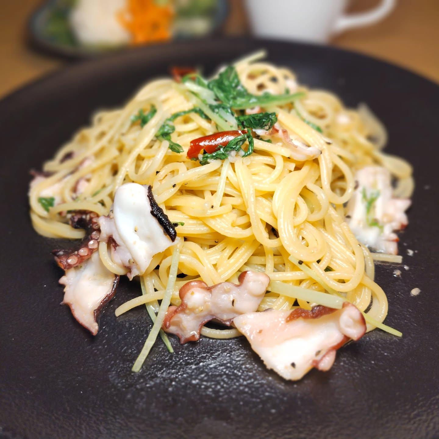 🐙\たこと水菜ペペロンチーノ/🌶️🧄