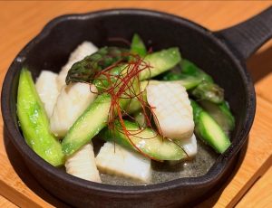 ◆グリーンアスパラとイカのガーリックソテー 旬の味わい。ニンニクで香ばしく仕上げました ◆ベビーコーンのフリット 愛知県産 旬の皮付きベビーコーンをカラッと揚げました