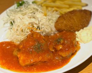 本日のおすすめランチです チキンのトマト煮込み&白身魚のフライ😊 数量限定販売となっております。 スープ、ドリンク飲み放題♪ライス大盛り、おかわり無料♪♪ 本日も沢山のご来店お待ちしております😊