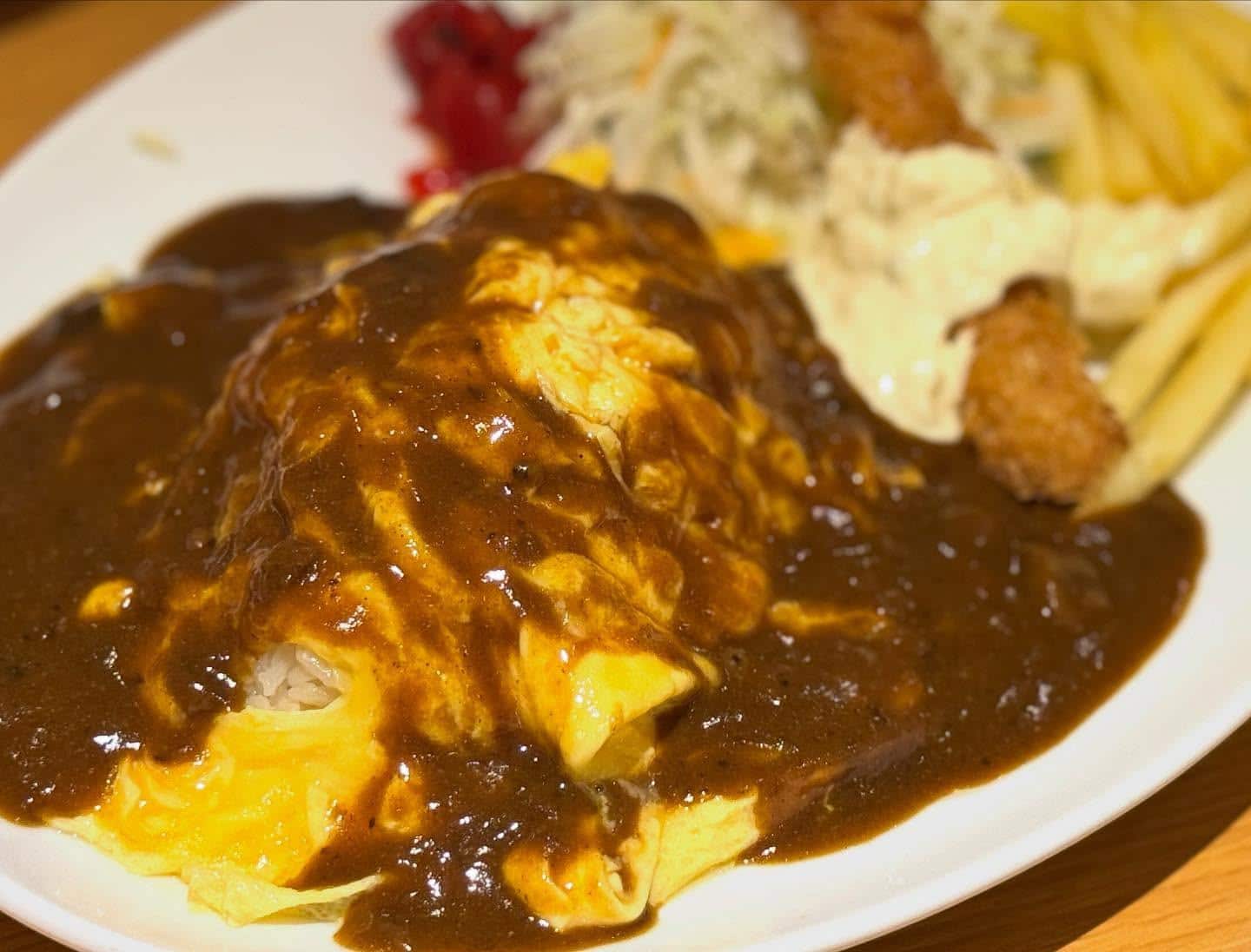 本日のおすすめランチです オムカレー&海老フライ😊 数量限定販売となっております。 スープ、ドリンク飲み放題♪ライス大盛り、おかわり無料♪♪ 本日も沢山のご来店お待ちしております😊