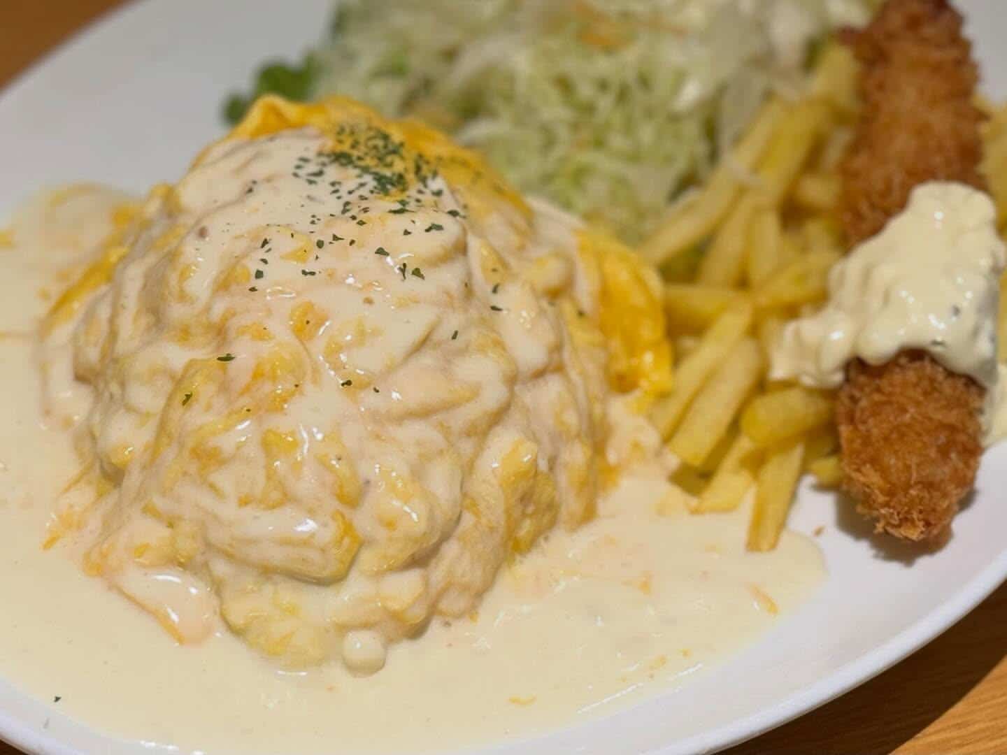 本日のおすすめランチです オムライス〜クリームソース〜&海老フライ😊 数量限定販売となっております。 スープ、ドリンク飲み放題♪ライス大盛り、おかわり無料♪♪ 本日も沢山のご来店お待ちしております😊