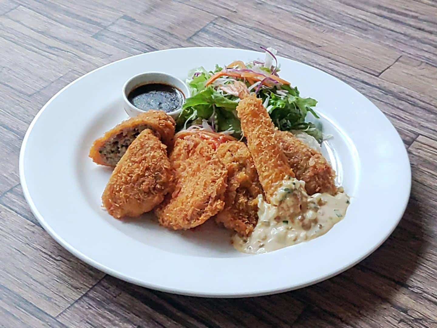 ◆秋のミックスフライ 広島産カキ、海老、ネギメンチ、紅はるか、生椎茸 ~デミグラスソース&もろみタルタルソース~