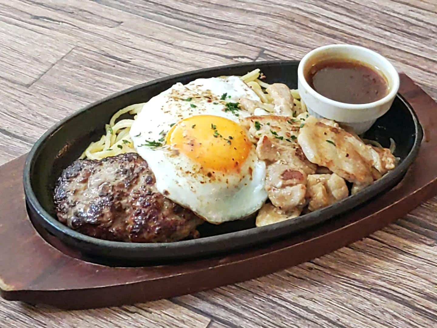 スパゲッティ、目玉焼き ライスorパン、サラダ付き
