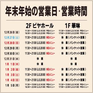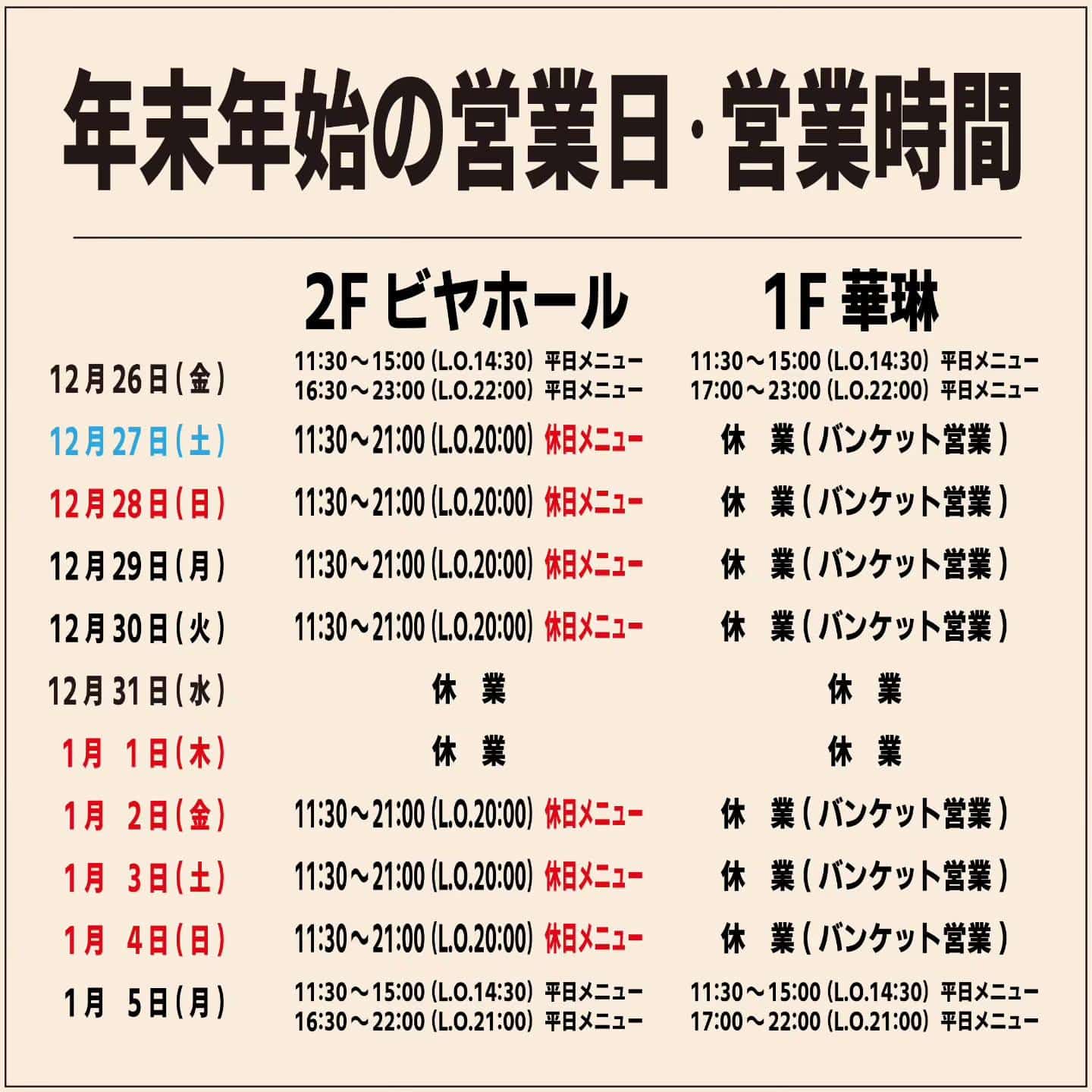 2Fビヤホールは 12月29,30日・1月2日は1130~21:00の通し営業となり休日メニューの提供となります🎶 是非ご利用くださいませ❤