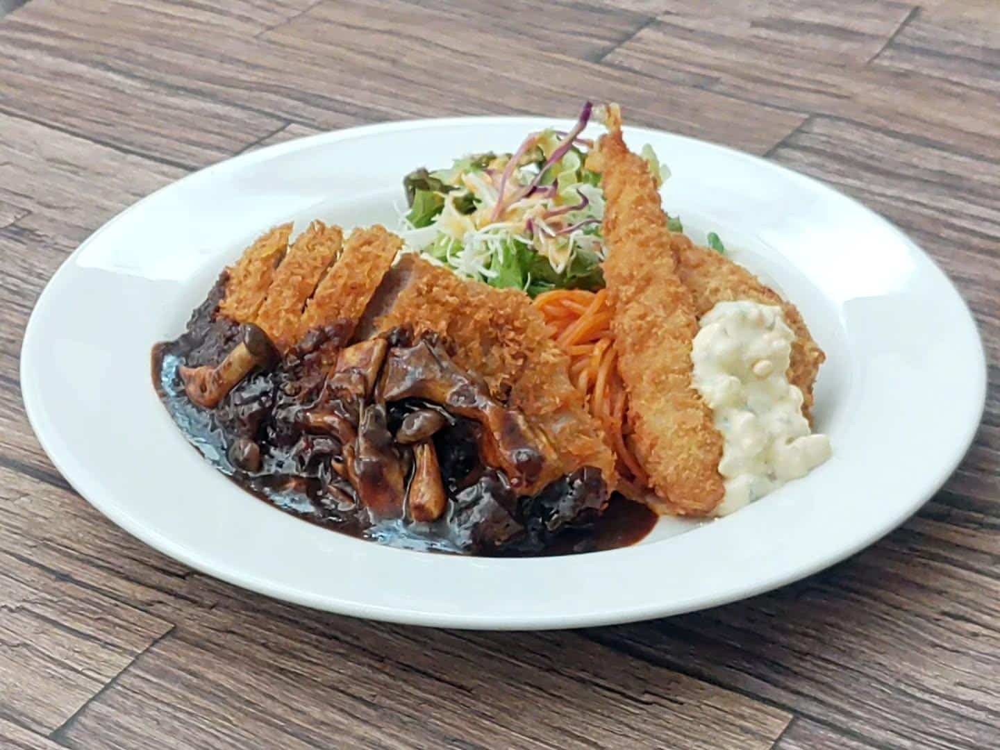 ◆ミックスフライのトルコライス 豚ロースカツ、広島産カキフライ、エビフライ ~木の子のブラウンソース~