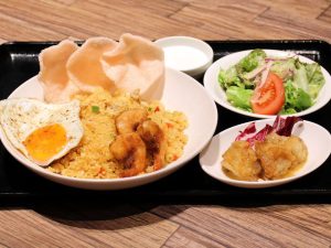 スィートチリチキン、ガーリックシュリンプ、目玉焼き、サラダ、デザート付