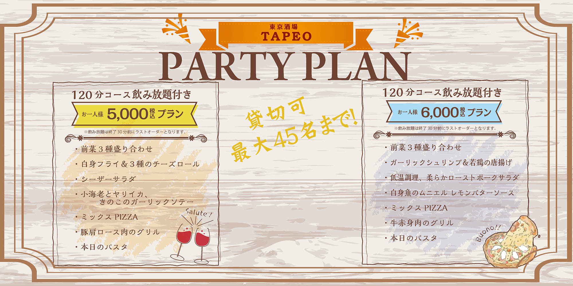 ●飲み放題付の宴会メニューは、お席のご利用がゆったり150分。 各種ご宴会には人気料理をまとめて楽しめる(飲み放題付)コースがおすすめ! 5000円、6000円コースとも120分の飲み放題がついてお席のご利用は150分。 各コースとも、前菜盛り合せから人気のグリルミート盛合せ、ピザなど充実したお料理をご用意。 プロジェクターを持ち込みいただくとスクリーンのご利用可能で、貸切パーティーも人気です。