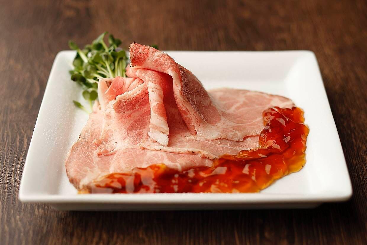 ローストポークは食べやすくスライスされたものにさっぱりとポン酢ジュレがかかっています♪ぜひおつまみにいかがでしょうか