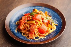 茄子とベーコンにトマトソースとケチャップの旨味のつまったどこか懐かしい味わいの一皿です♪