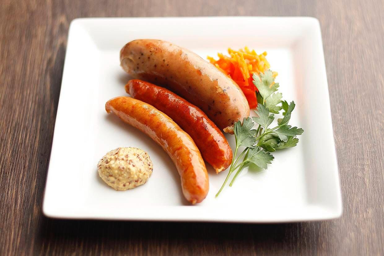 三種類のソーセージをグリルしましたお好みで粒マスタードをつけて召し上がれ