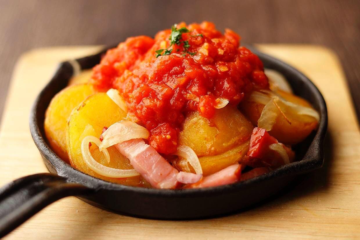 かりほくなジャーマンポテトにベーコンとオニオンの旨味とピリ辛のトマトソースが最高♪