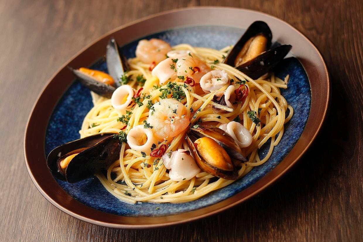 エビとイカとムール貝を使用し魚介の旨みとガーリックの効いたパスタです♪