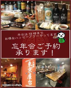 忘年会シーズン到来ですね! 東京屋台もご宴会ご予約を承り中! 飲み放題付きのご宴会コースご用意しております!! 少人数の飲み会から大人数宴会まで様々なシーンにご利用いただけます。 お一人様も大歓迎!! 平日はお得なハッピーアワーもありますよ🍻 お気軽にお立ち寄り下さい!!