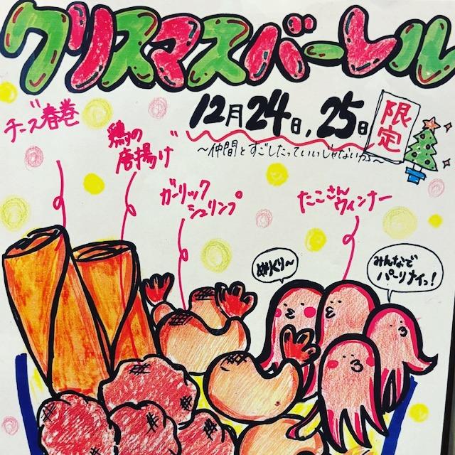 とん新宿三井ビル店のクリスマスは 🎉クリスマスバーレル😁 いつものアンドレがパワーアップ💕 人気者のタコさん チーズ春巻き 鶏から そしてガーリックシュリンプ ポテトフライもついてます 盛りだくさんの内容です 12月24日25日限定販売です