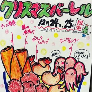クリスマス限定商品 クリスマスバーレル うまいものいろいろ入ってます チーズ春巻き 鶏のから揚げ ガーリックシュリンプ タコさんウィンナー ポテトフライ これだけで結構楽しめます もちろん 串焼きもお忘れなく🍺