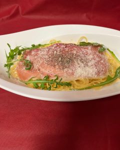 『アトランティックサーモンのワイン蒸し とまとのピラフ詰添え アメリケーヌソース』