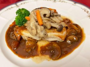 『アトランティックサーモンのソテー ポテトとベーコン添え トリュフの白ワインソース』