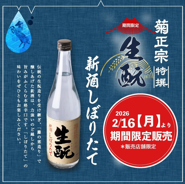 今年もこの季節がやってまいりました! 2026/2/16(月)より 「新酒 菊正宗しぼりたて 特撰」 を期間限定で販売いたします! 伝統の生酛造りを受け継ぎ、「灘の寒造り」で醸しあげた 新酒は、力強いのど越しから旨みがふくらむ本格辛口です。 「しぼりたて」の味わいをぜひともお楽しみください。