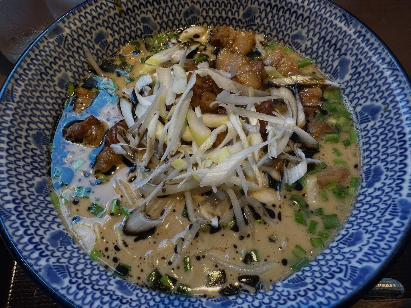 濃厚な白胡麻スープに竹炭ラー油、上にはたっぷり肉厚のイベリコ豚をトッピング😊
