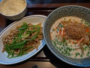 自家製ラー油の辛さの中に白胡麻の深いコクがある人気の担々麺と、これまた定番の青椒肉絲の組み合わせ😊